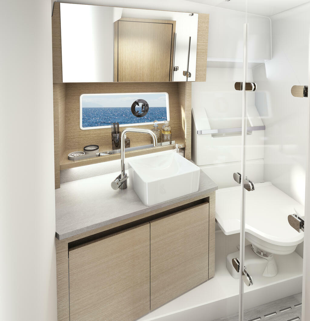 Außergewöhnlich großes Bad - Eine Besonderheit in der 33 Fuß-Klasse: Das mondän ausgestattete Bad bietet eine separate Duschkabine und begeistert mit dem großflächigen Einsatz von Holz.